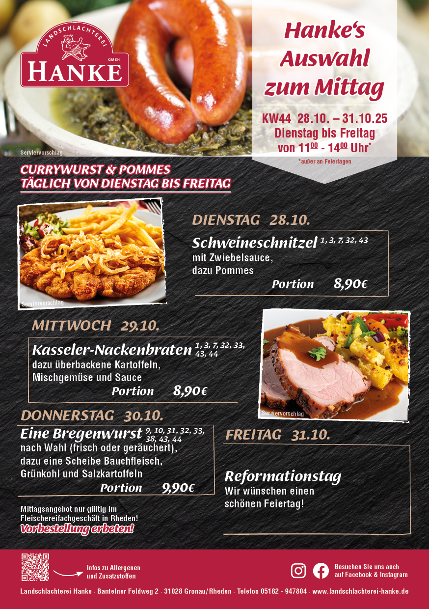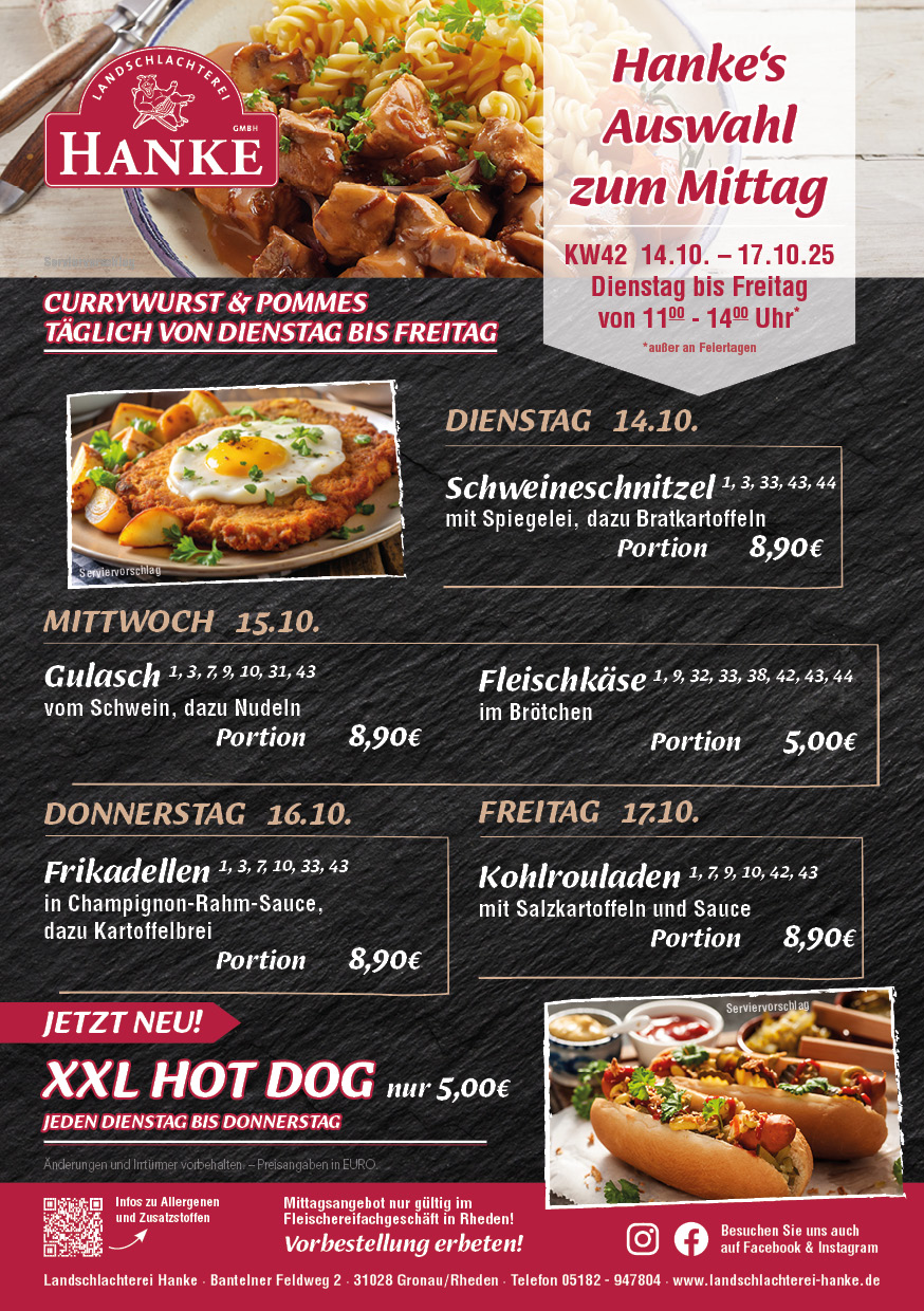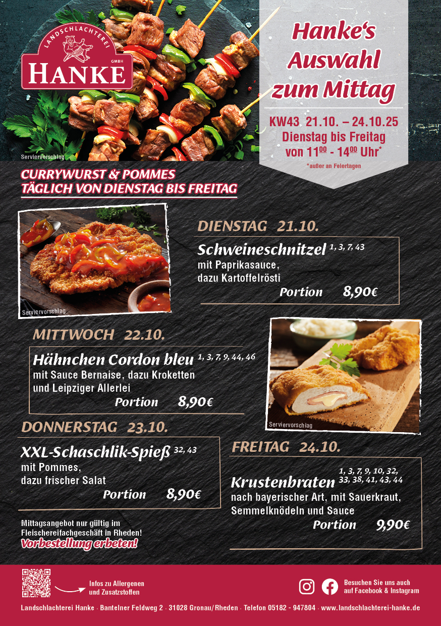 Allergene: 1 = Gluten und Erzeugnisse daraus, 2 = Krebse und Erzeugnisse daraus, 3 = Eier und Erzeugnisse daraus, 4 = Fisch und Erzeugnisse daraus, 5 = Erdnuss und Erzeugnisse daraus, 6 = Soja und Erzeugnisse daraus, 7 = Milch / Milcheiweiß und Erzeugnisse daraus incl. Laktose, 8 = Schalenfrüchte und Erzeugnisse daraus, 9 = Sellerie und Erzeugnisse daraus, 10 = Senf und Erzeugnisse daraus, 11 = Sesam und Erzeugnisse daraus, 12 = Schwefeldioxid und Sulfite, 13 = Lupine und Erzeugnisse daraus, 14 = Weichtiere und Erzeugnisse daraus
